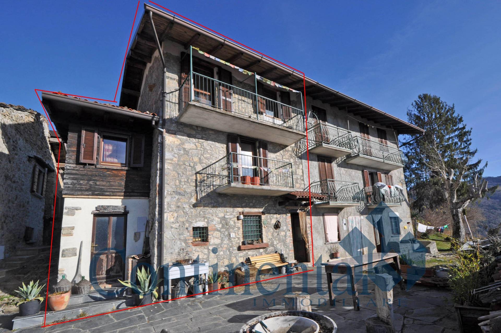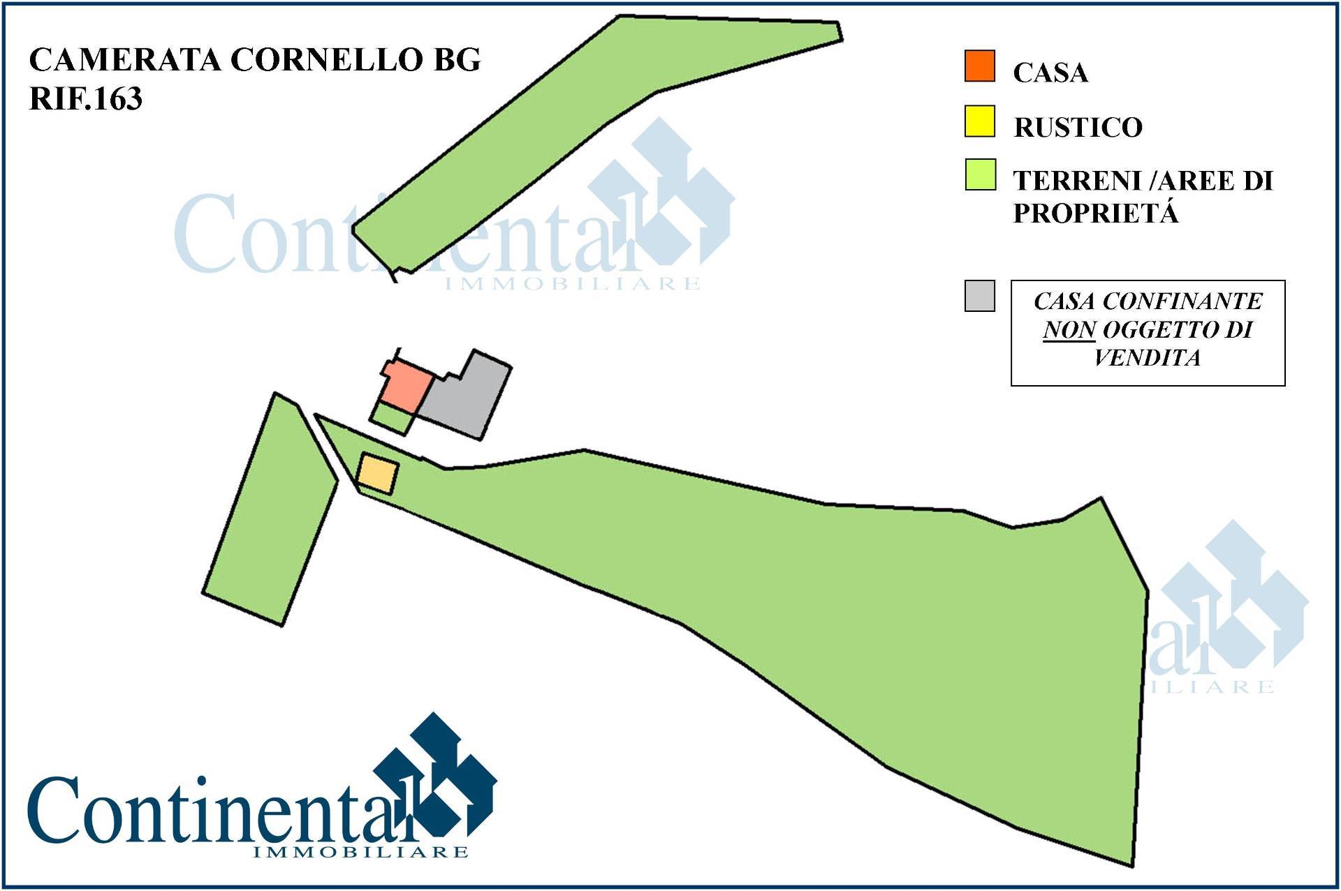 A Camerata Cornello Bergamo, località Garzani Di Sotto. Proprietà immobiliare costituita da una porzione di casa su tre livelli ed un rustico. La casa, che dista circa 30 metri dalla strada carrale viene venduta completamente arredata. Così composta: ingresso indipendente che da accesso alla cucina a piano terra dalla quale parte la scala privata che conduce al piano primo che ospita: un disimpegno, una camera da letto con balcone, bagno. A piano secondo, spaziosa camera da letto con soffitto in legno a vista e balcone panoramico. Riscaldamento garantito da stufe a pellet. A completare la proprietà: ripostiglio con accesso dall'esterno, corte terrazzata e rustico indipendente su due livelli di circa 35 mq censito deposito ed annessi 3.300 metri quadri di terreno agricolo.