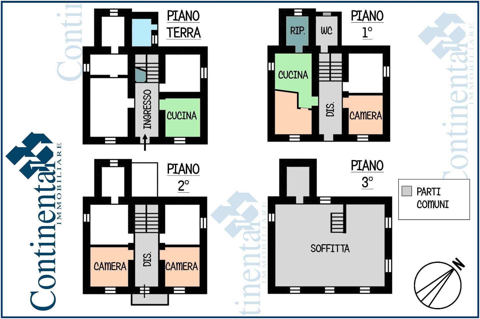 Porzione di casa disposta su tre livelli, collegati da scala comune. Al piano terra si trovano l'ingresso, la cucina, un pratico ripostiglio sottoscala e un bagno con accesso dall'esterno. Il primo piano ospita una luminosa zona giorno con soggiorno, sala da pranzo, cucina e bagno in comune, mentre al secondo piano si sviluppa la zona notte con due camere da letto. Sottotetto in compromprietà. La soluzione comprende inoltre terreni a prato di 754 mq, ideali per chi desidera avere a disposizione ampi spazi verdi.